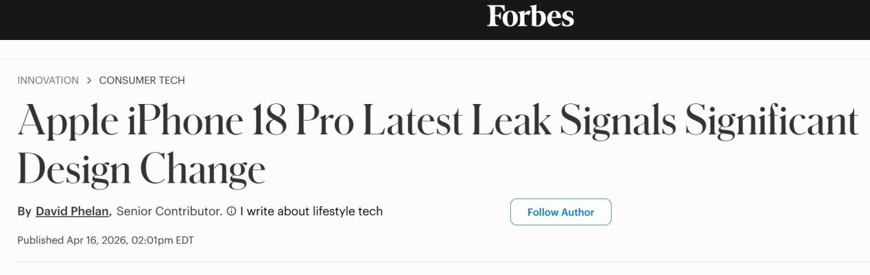 【环球网科技综合报道】4月17日消息,据forbes报道称,供应链消息显示,苹果正对正面
